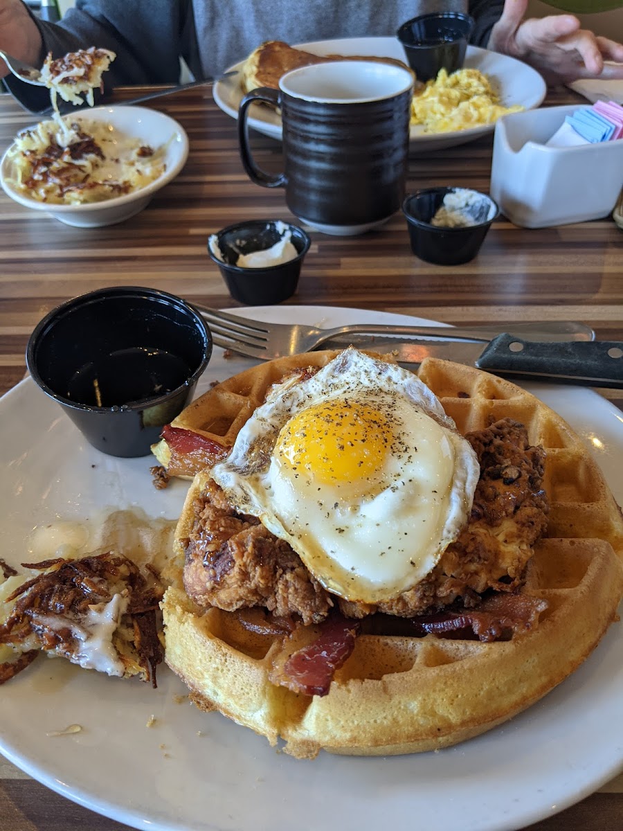 Chicken and Waffles Bourbon Syrup and Two Big Pieces of Bacon